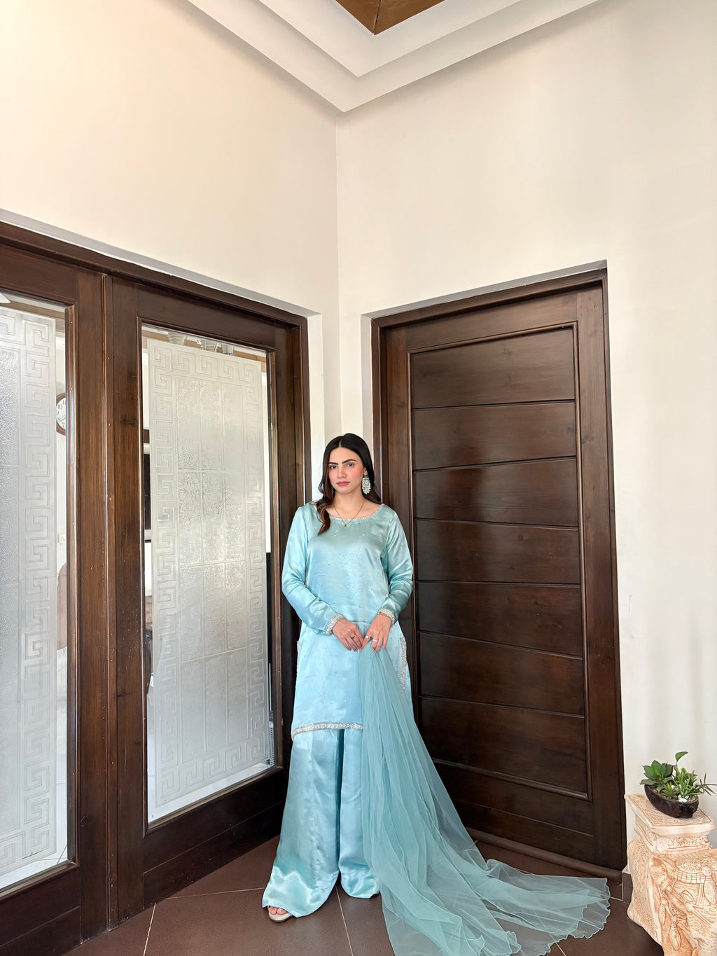 An elegant aqua silk three piece sharara set designed for festive sophistication. The kurti-style shirt features delicate sequin patchwork on the neckline, sleeves, and hem, paired with a flowing silk sharara and a sheer net dupatta for a graceful, timeless look.