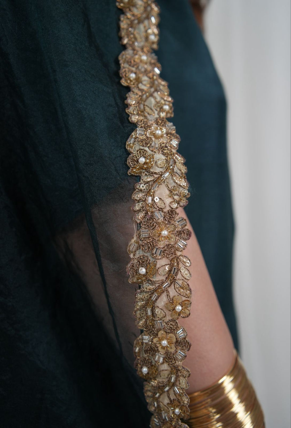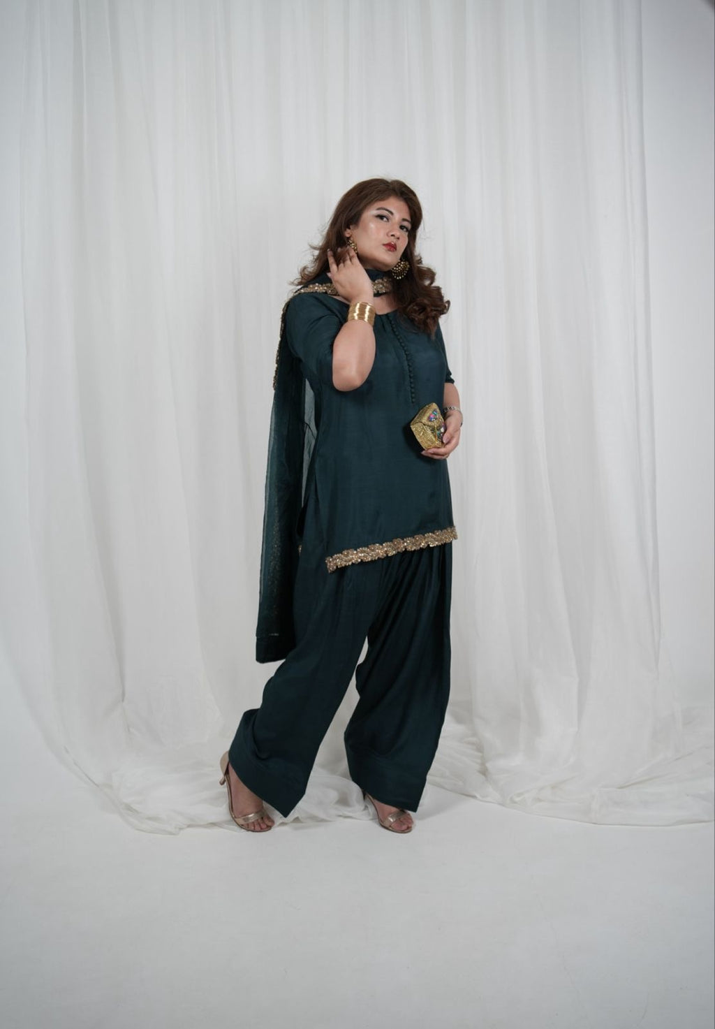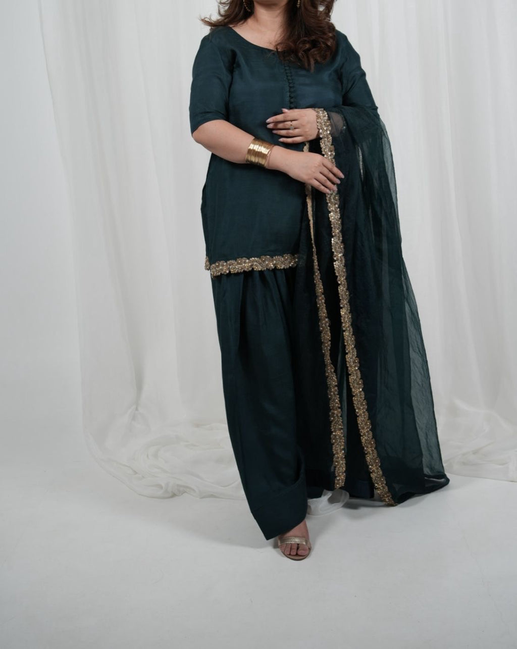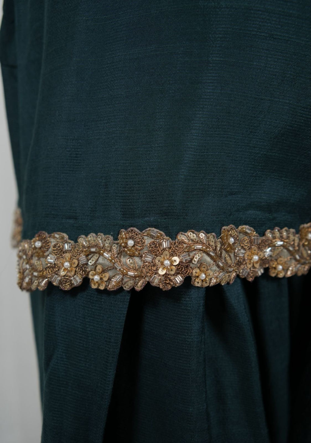 The Green Farshi Set is defined by its deep jewel tone and superior material quality. Crafted from premium Korean silk, the fabric offers a rich, smooth texture and a soft, elegant sheen that ensures a luxurious wearing experience. The fabric’s substantial weight provides a structured, effortless drape, perfect for a majestic formal silhouette.